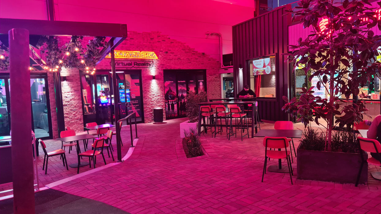 Heaps of tables out front in the courtyard provide a comfortable space to gather, refuel, and share the thrills of your virtual adventures.